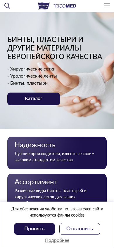 | SEO-описание | Мы предлагаем широкий выбор бинтов, пластырей и хирургических сеток от известных брендов Matopat и Tricomed. Надежные современные перевязочные материалы для заботы о вашем здоровье! |
