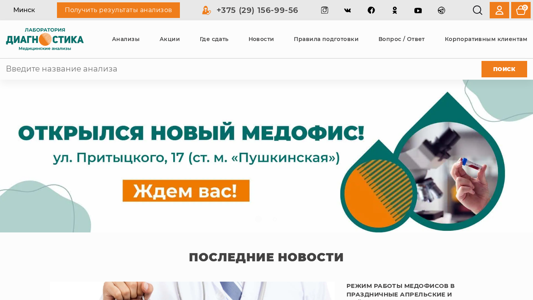 | SEO-описание | Сдать анализы в Минске. Более 500 исследований по 15 направлениям. Доступные цены. Есть акционные предложения для Пациентов. |