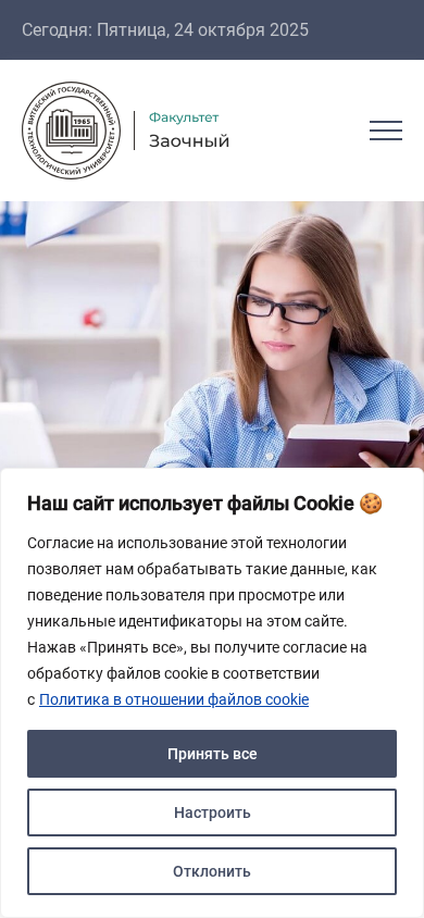 | SEO-описание | Факультет организован в 1965 году. Для обучения без отрыва от производства в 1965-1966 учебном году поступило 75 студентов. Первый выпуск специалистов с высшим образованием по заочной форме обучения состоялся в 1971 году. |