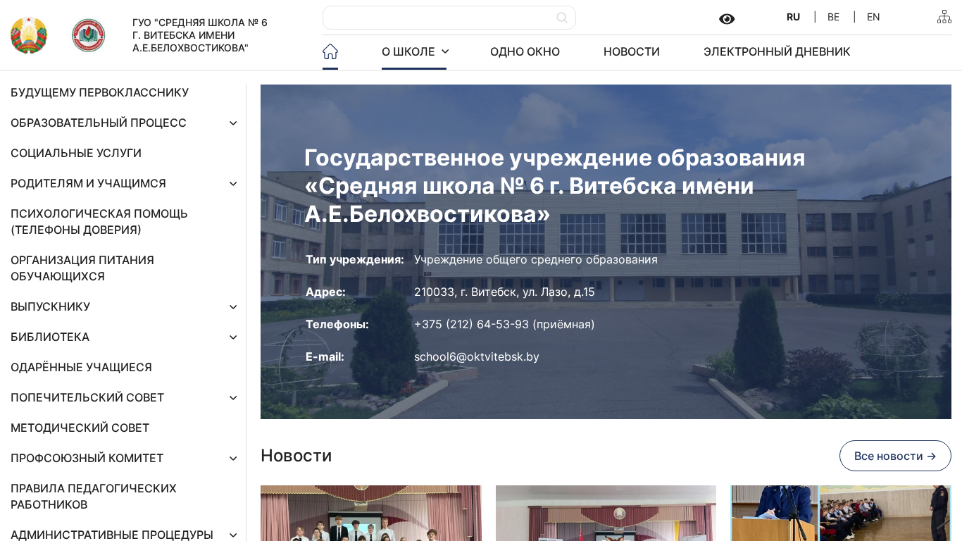 | Название / Заголовок | О школе - ГУО "Средняя школа №6 г. Витебска имени А.Е.Белохвостикова" |