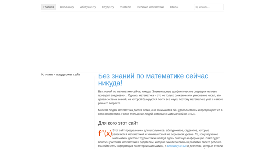 | SEO-описание | Учим математику вместе. Математика от начальной школы до 11 класса. Репетиторы по математике для студента, школьника и абитуриента. Подготовка к ЦТ и экзаменам по математике. Решение контрольных и типовых задач по высшей математике. |