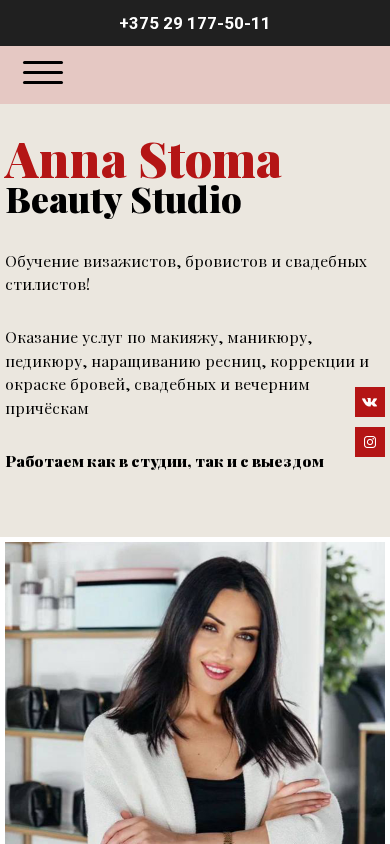 | SEO-описание | Студия Красоты Анны Стома оказывает услуги по макияжу, маникюру, педикюру, наращиванию ресниц, коррекции и окраске бровей, свадебных и вечерним причёскам. Обучение визажистов, бровистов и свадебных стилистов! Анна Стома является основателем студии красоты и ведущим визажистом международного уровня с опытом работы более 12 лет. Действующим преподавателем в собственной школе макияжа «Anna Stoma Beauty Studio» Непрерывно повышает свою квалификацию, проходит различные стажировки, мастер-классы и семинары. |