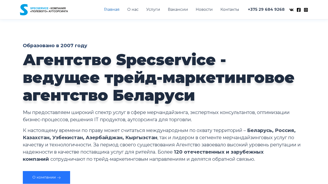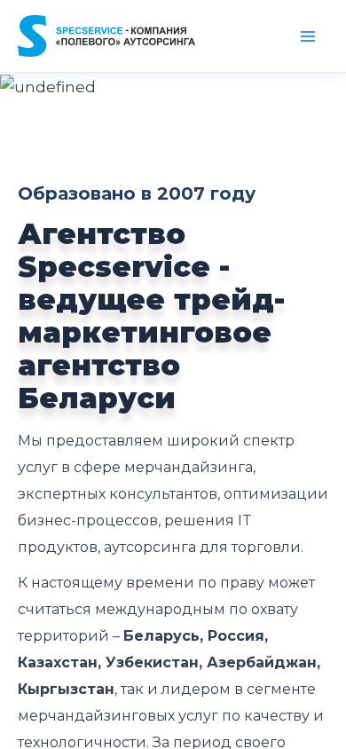 | SEO-описание | Агентство Specservice — лидер трейд-маркетинга и мерчандайзинговых услуг в Беларуси. Охват: Беларусь, Россия, Казахстан и другие страны. Более 5700 торговых объектов, 140 клиентов. Быстрый запуск проектов и онлайн-отчетность. Индивидуальные решения для вашего бизнеса. |