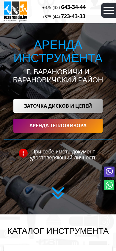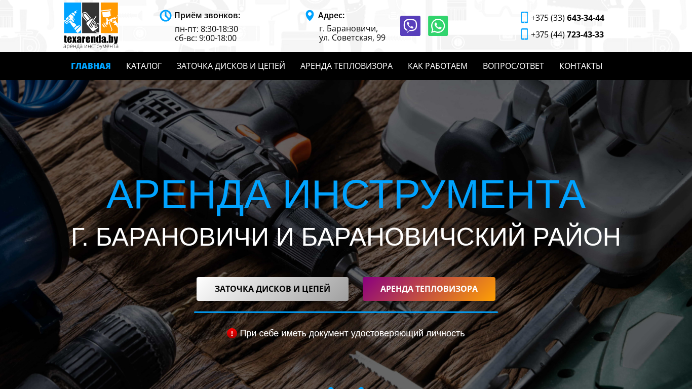 | SEO-описание | Texarenda.by предлагает аренду широкого ассортимента инструментов, аренда тепловизора и услуги по заточке дисков цепей в Барановичах. Наш профессиональный инструмент поможет вам в решении задач любой сложности. Наш адрес город Барановичи улица Советская 99, заявку можно оставить по номеру телефона +375 33 643 34 44 |