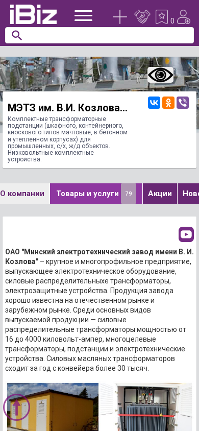 | Название / Заголовок | МЭТЗ им. В.И. Козлова ОАО - Комплектные трансформаторные подстанции (шкафного, контейнерного, киоскового типов мачтовые, в бетонном и утепленном корпусах) для промышленных, с/х, ж/д объектов. Низковольтные комплектные устройства. . 220037, Минск, , Уральская, 4, каб. 502 |