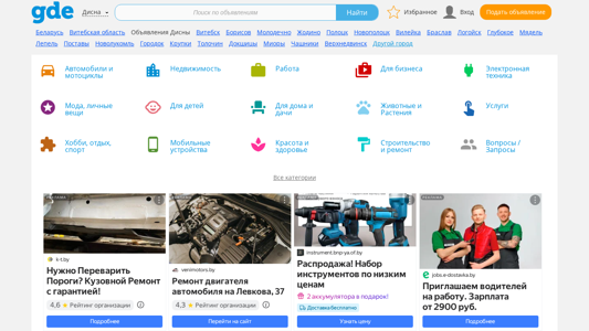 | SEO-описание | Gde.by - популярная доска бесплатных частных объявлений Дисны. На нашем сайте Вы найдете актуальные объявления от частных лиц и деловых организаций Дисны. Любой желающий может подать собственное объявление абсолютно бесплатно. |