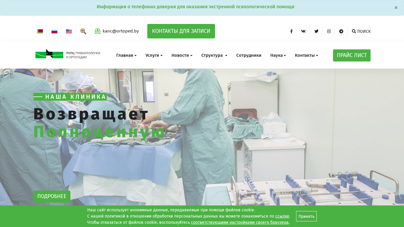 | SEO-описание | ГУ «РНПЦ травматологии и ортопедии» - оказание высококвалифицированной специализированной травматолого-ортопедической помощи населению Республики Беларусь и иностранным гражданам |