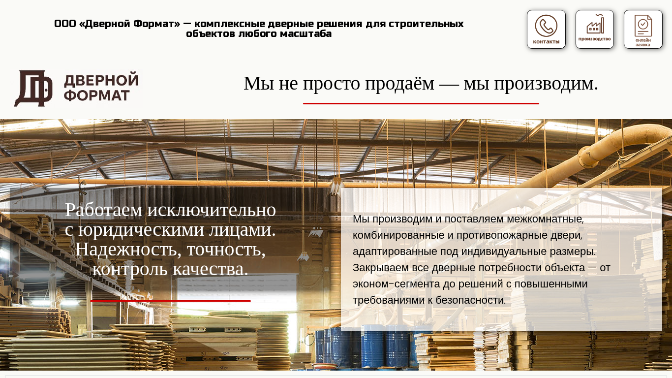 | SEO-описание | ООО «Дверной Формат» — комплексные дверные решения для строительных объектов любого масштаба Мы не просто продаём — мы производим. Работаем исключительно с юридическими лицами. Надежность, точность, контроль качества. Мы производим и поставляем межкомнатные, комбинированные и противопожарные двери, адаптированные под индивидуальные размеры. Закрываем все дверные потребности объекта — от эконом-сегмента до решений с повышенными требованиями к |