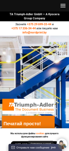 | AI-анализ | The portal "NordPrint.by" is an e-commerce website selling Triumph-Adler Kyocera printers and multifunction units in Belarus. It is the exclusive distributor of Triumph-Adler in the Republic of Belarus. The website provides information about Triumph-Adler products, answers to common questions, and contact details for the company TA Triumph-Adler GmbH. Users can contact NordPrint by phone at +375 29 699-33-44 and +375 17 336-34-44 or via email at info@nordprint.by. The website also offers information on payment and delivery options, as well as a guarantee. NordPrint not only sells Triumph-Adler technology but can also create a printing system from scratch, starting with an analysis of a company |