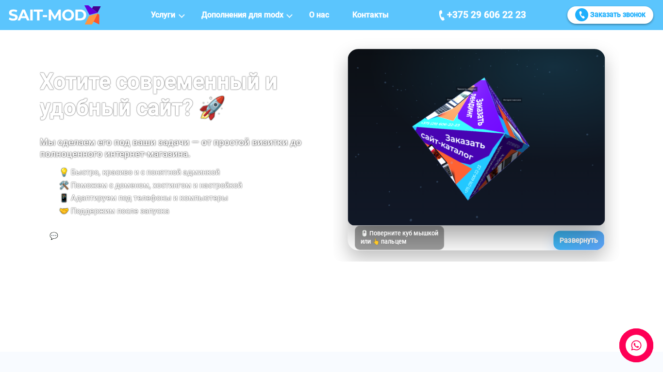 | AI-анализ | title: Создаём сайты и интернет-магазины на MODX — SAIT-MODX This online resource is a professional web development service specializing in creating websites and online stores using MODX. The offered services include landing pages starting from 290 BYN, multi-page websites for 1 400 BYN, and catalogs for 2 800 BYN. With over 300 completed projects and 9 years of experience, SAIT-MODX provides support and SEO for MODX websites. |