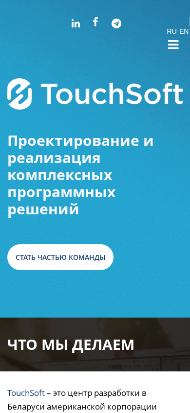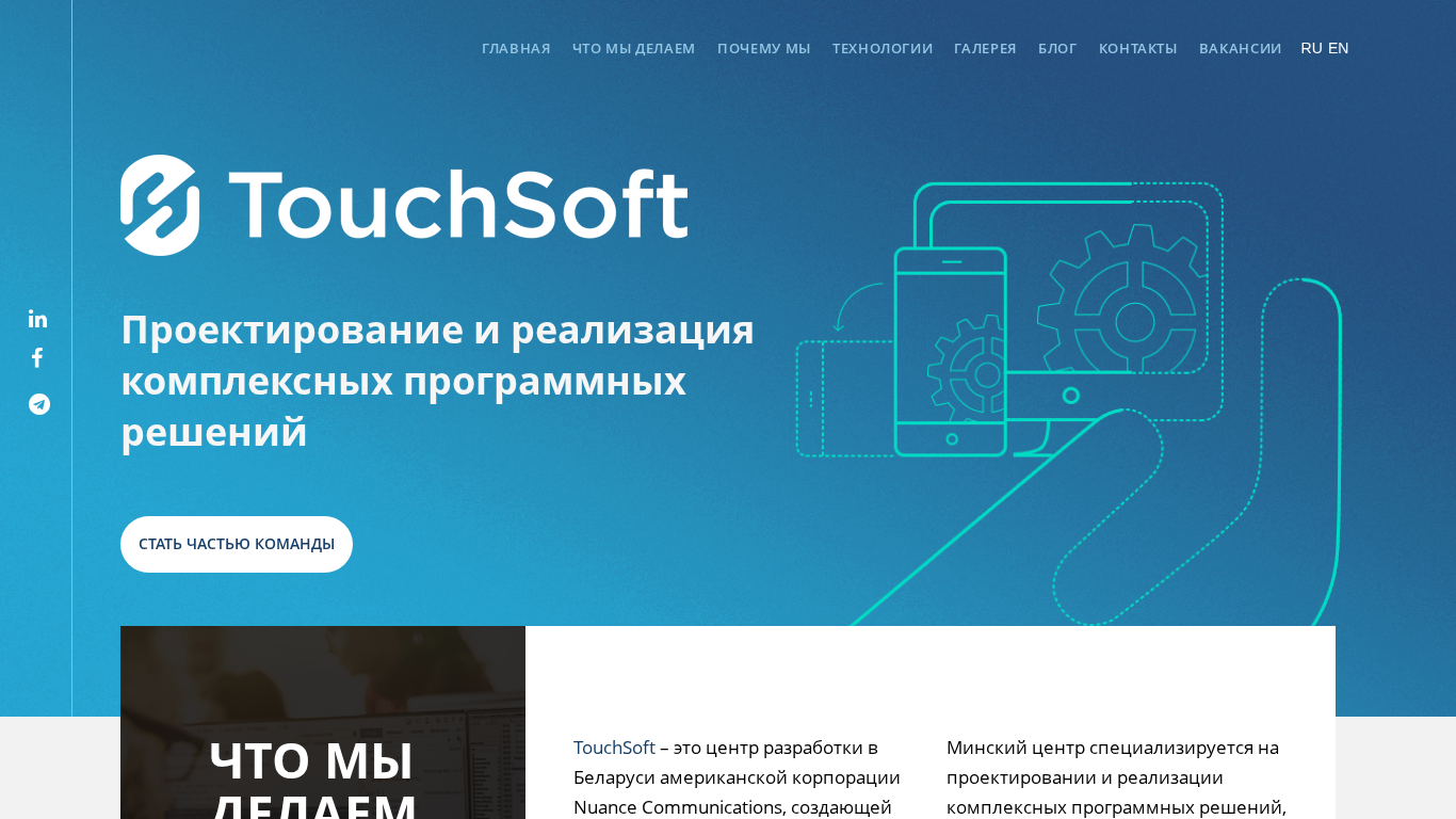 | AI-анализ | The website <http://touchsoft.by> is the official homepage of OOO Taчсофт, a software development center based in Minsk, Belarus, that is a subsidiary of Nuance Communications, an American corporation specializing in software for speech recognition, automated call processing, document management, and symbol recognition. The website provides information about the company's services, which include the design and implementation of complex software solutions to enhance online sales through the use of a contact center that supports communication with users via chat, voice calls, SMS, Facebook, and Twitter. The site features sections for the company's mission statement, a gallery of projects, a blog, contacts, vacancies, and a section on the company's history and values. The company takes pride in its team of skilled professionals and the friendly atmosphere at the workplace. They are currently developing components and modules for the RightTouch ™ ( |