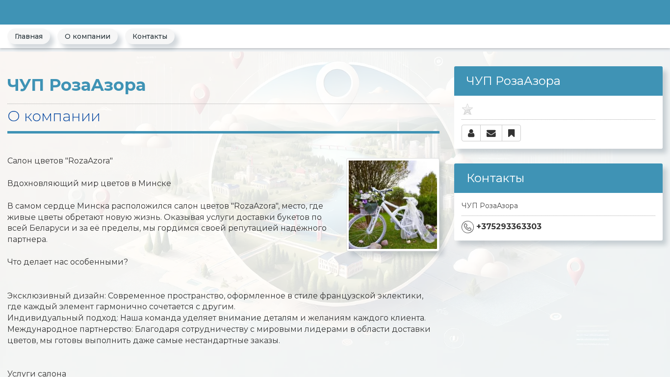 | SEO-описание | ЧУП РозаАзора - г. Минск,пр. Независимости, д.186, пом. 106, +375293363303 |