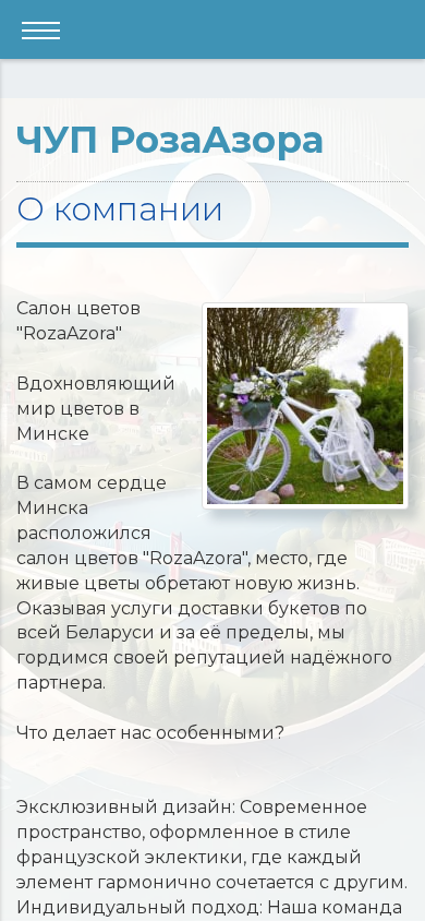 | AI-анализ | This website is for the company "ЧУП РозаАзора" located in Independence Prospect 186, apartment 106 in Minsk, Belarus. The company specializes in flower sales and delivery services. The website contains information about the company, its contacts, and additional services such as creating floral arrangements for various events and seasonal decoration. The design of the website is modern and elegant, with a focus on French eclecticism. The company prides itself on its reputation for reliable flower delivery, both domestically and internationally. The website also features a panel for site management and the option to add more information. |