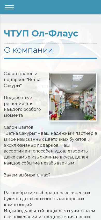 | AI-анализ | The website ЧТУП Ол-Фlaус (<https://vetkasakury.vrb.by>) is a company based in Minsk, Belarus, located at ul. Syrkomly V., d.20, kv. 114. The website offers a flower and gift shop named "Ветка Сакуры" (Sakura Branch). The homepage includes sections for the company and contacts. The website uses various JavaScript and CSS files from the domain <https://vrb.by/>. The page structure is designed to be responsive, adjusting to different window sizes. The website primarily focuses on selling flowers and gifts for various occasions, emphasizing individual customer service and a wide range of choices from classic bouquets to exclusive author creations. The contact information provided is a phone number: +375293553233 |