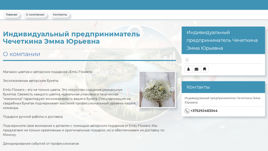 | AI-анализ | This website belongs to Individual Entrepreneur Chechetkina Emma Yuryevna, located in Minsk, Vavashina 22a-97 street. The website features information about the company, contacts, and a flower and handmade gift shop named EmiLi Flowers. The shop specializes in creating exclusive flower bouquets, offering not only fresh flowers but also ideal packaging and unique artistic touches. They focus on wedding bouquets, highlighting their professional team's high level of expertise. The shop also provides handmade gifts and delivery services within Minsk. Additionally, they offer decoration services for various events. The website is operated by Individual Entrepreneur Chechetkina Emma Yuryevna. |