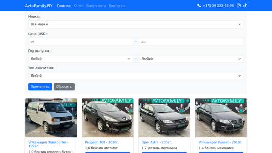 | AI-анализ | language: ru This online resource is an auto dealership located in Grodno, Belarus, represented by the domain name AvtoFamily.by. It offers a wide range of used vehicles for sale, accepting trade-ins and providing various purchase options, including commission sales, outright buyback, leasing, and financing. The dealership seems to cater to various types of vehicles, from sedans and minivans to SUVs and vans, featuring brands such as Volkswagen, Peugeot, Renault, Opel, Audi, and others. The website also appears to provide detailed information on vehicle specifications, pricing, and financing plans. |