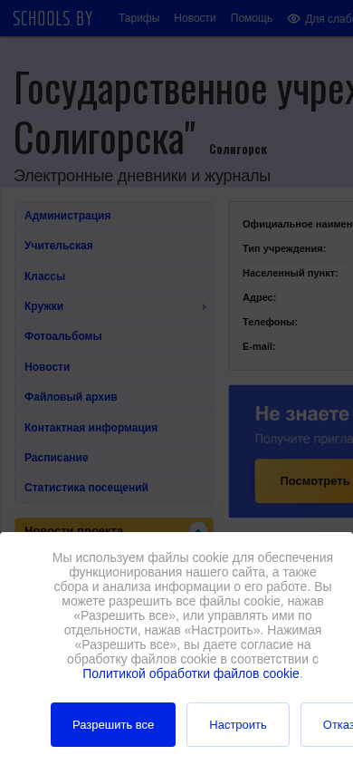 | AI-анализ | This website is the official website for State Educational Institution "Middle School No. 8" in Soligorsk, Belarus. It uses cookies for website functionality and data collection and analysis. Visitors can allow or manage cookie settings by clicking on the "Cookie Settings" button, which appears as a pop-up message. The website has a light color scheme with images disabled and a font range of A-A+. The title of the website is "Государственное учреждение образования "Средняя школа № 8 г. Солигорска"" (State Educational Institution "Middle School No. 8 of Soligorsk") and the description contains keywords related to the school and its educational function. |