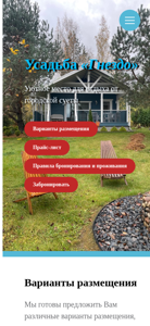 | AI-анализ | This website is for a rural estate called "Гнездо" (Nest in English), offering rental homes. The home rental options include two separate houses and the entire estate, with different capacities and additional services. Prices range from 750 to 1000 rubles per day. Each rental includes exclusive use of the entire property. A discount of 10% is given for bookings longer than three days. Contact information is provided, along with a price list and booking rules. Social media links to Instagram are also included. |