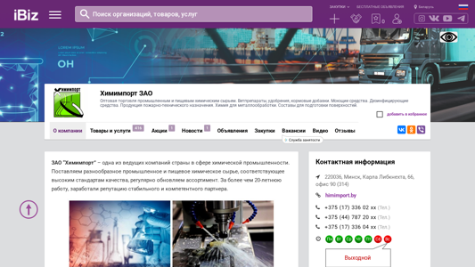 | Название / Заголовок | Химимпорт ЗАО - Оптовая торговля промышленным и пищевым химическим сырьем. Ветпрепараты, удобрения, кормовые добавки. Моющие средства. Дезинфицирующие средства. Продукция пожарно-технического назначения. Химия для металлообработки. Составы для подготовки поверхностей.. 220036, Минск, , Карла Либкнехта, 66, офис 90 (314) |