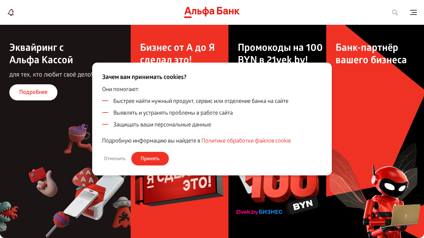 | SEO-описание | Альфа Банк предлагает комплексные банковские услуги для поддержки бизнеса: расчетно-кассовое обслуживание, кредиты, эквайринг и другие решения для предпринимателей в Беларуси. |