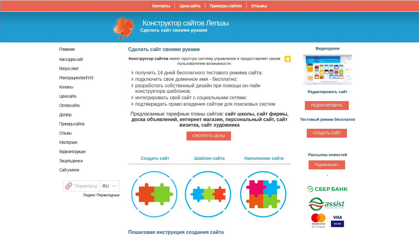| AI-анализ | language: ru The website is a site builder platform named Lepshy, offering an easy and quick way for users in Belarus to create their own websites. With a simple site management system, users can avail of a 14-day free trial, connect their own domain name for free, develop a personal design using an online constructor, integrate social media, and confirm site ownership for search engines. The offered tariff plans include websites for schools, firms, classified ads, online stores, personal sites, business cards, and artist sites. The cost of a site on the platform is determined based on the chosen tariff plan and can be paid monthly or for a longer period. The site includes sections for contacts, pricing, examples of client-made sites, user reviews, and video instructions for use. Examples of client sites, user reviews, and contact information for state institutions such as the "Territorial Center for Social |
