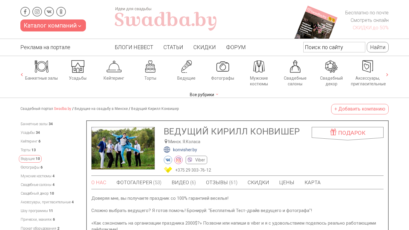 | SEO-описание | Кирилл Конвишер Ведущий на свадьбу в Минске с фото и отзывами. Адреса, контакты и отзывы. |