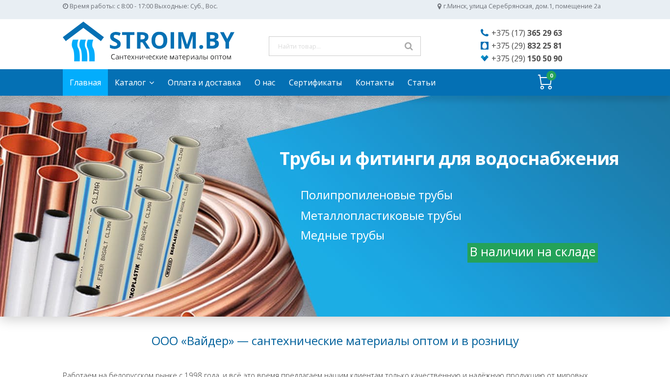 | SEO-описание | Оптовая продажа сантехнических материалов: труб, фитингов и насосов в Минске в ассортименте компании ООО Вайдер. ➤ Низкие цены, гарантия качества и скидки при покупке |