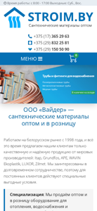 | AI-анализ | Equipment for water supply, heating, and sewage in Minsk. Optical sales of sanitary materials: pipes, fittings, and pumps by OOO Wider in Minsk's assortment. ➤ Low prices, quality guarantee, and discounts upon purchase. Open: 8:00 - 17:00, closed on weekends. Minsk, Silvernyi Street, house 1, room 2a. +375 (17) 365 29 63, +375 (29) 832 25 81, +375 (29) 150 50 90. Menu: Home, Catalog, Metalloplastik plastic pipes and fittings, Compression fittings, Press fittings |