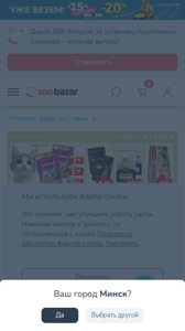 | SEO-описание | Товары для животных в наличии и под заказ: корма, лакомства, игрушки и аксессуары. Бесплатная доставка при заказе от 59BYN в Минске, от 35BYN в Бресте, Витебске, Могилёве, Гродно и Гомеле доставка в день оформления заказа. Zoobazar.by. |