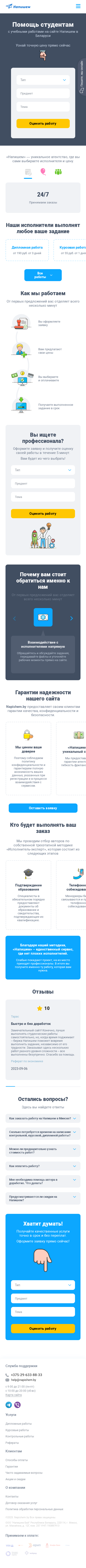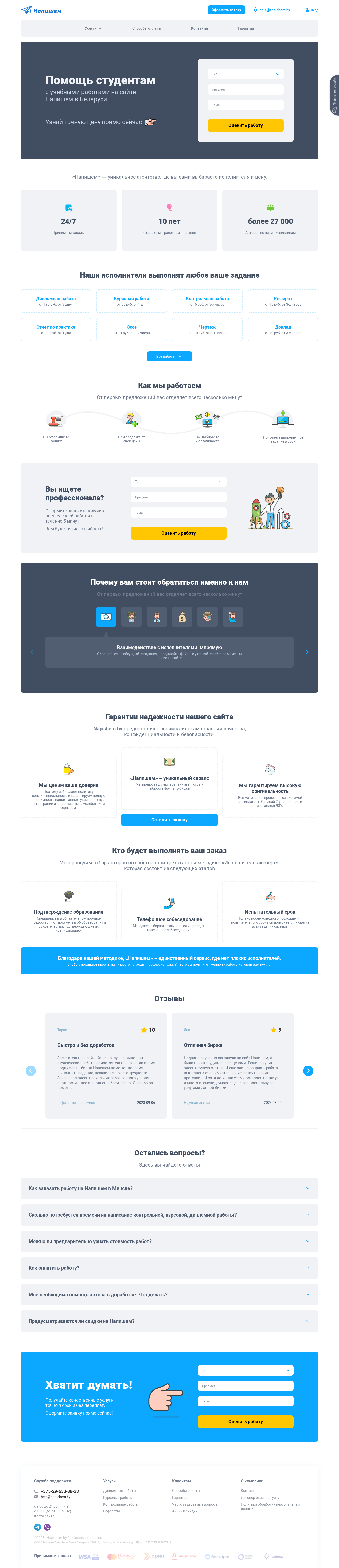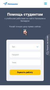 | SEO-описание | ✍ Помощь студентам в написании учебных работ на фриланс-бирже «Напишем» в Минске и Беларуси. Закажите дипломную, курсовую, контрольную работу или реферат. Без плагиата, гарантия качества и выполнения в срок! |