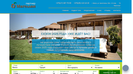 | SEO-описание | Магеллан работает с 2007г. Акции на раннее бронирование от более чем 10 операторов. Tez Tour, Coral Travel, TUI, Anex Tour, Pegas, Аэробелервис, Пляжные направления, горящие туры. Ждем Вас в офисе! |