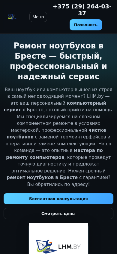 | AI-анализ | --- The web project LHM.by is a computer repair service based in Brest, Belarus. The title and description indicate that they specialize in repairing laptops and computers, including professional cleaning of laptops, replacement of thermal pastes, repair of video cards and motherboards, and diagnostic services. The website offers cheap and guaranteed prices for all repair works. The top words suggest that repair of laptops (33), cleaning (19), and replacement of thermal pastes (11) are key services. The website has a menu with sections on services, prices, a diagnostics guide, FAQ, and contacts. The contact number is provided for those who wish to call. The description emphasizes the expertise and quick turnaround of the team for laptop repairs. The website offers both quick and complex repairs, using professional equipment and quality components to ensure long-term stability. The description also highlights the importance of regular |