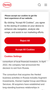 | SEO-описание | Henkel has signed an agreement on the sale of its business activities in Russia to a consortium of local financial investors. In April 2022, the company had announced the decision to exit from Russia. |