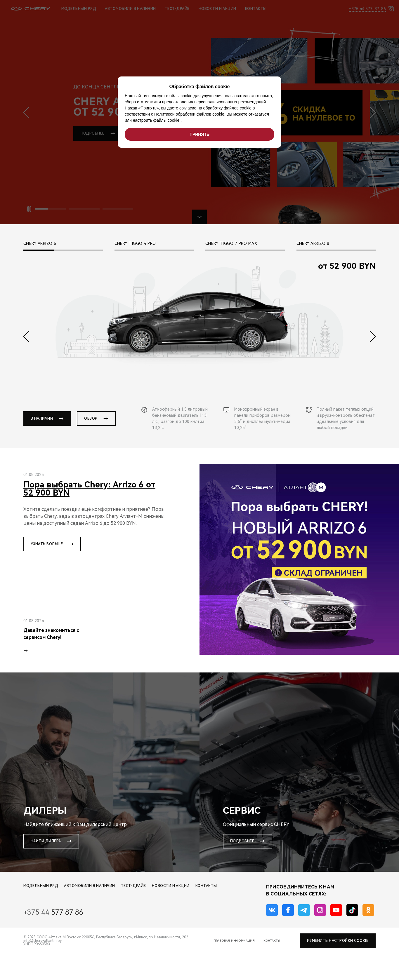 | SEO-описание | Автомобили Chery купить в Беларуси ✅ Официальный импортер машин Chery в Беларуси 🚘 У нас вы можете купить авто Chery в автосалоне 🔥 Новые модели китайских автомобилей Chery по выгодным ценам ✅ Записывайтесь на тест-драйв машин Чери! |