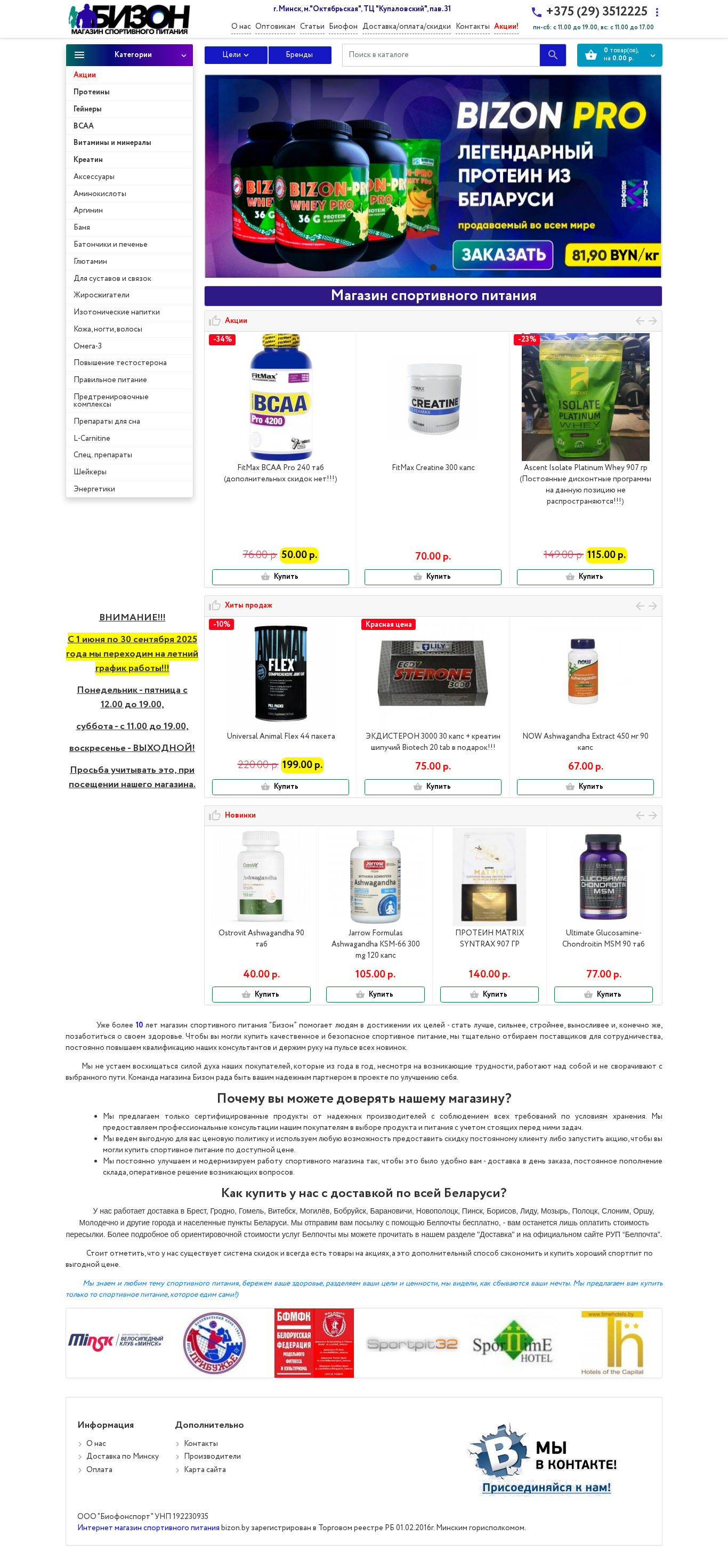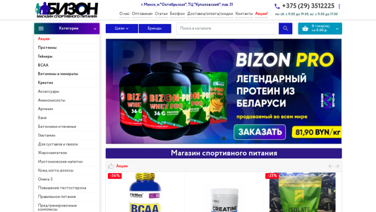 | AI-анализ | This is the website for the sports nutrition online store Bizon.by, located in Minsk, Belarus. The store offers a wide range of sports nutrition products including proteins, BCAA, creatines, vitamins and minerals, amino acids, and various supplements. The assortment includes isolates, casein, soy, and free-form amino acid proteins, as well as gheyners, BCAAs, vitamin and mineral complexes for men and women, and specialty items like L-carnitine and zinc. The store also sells accessories, energy drinks, and weight loss supplements. Customers can purchase items online or visit the store in person at the Octobersky shopping center, pavilion 31, in Minsk. The store's contact information is provided, including a phone number and email address for inquir |