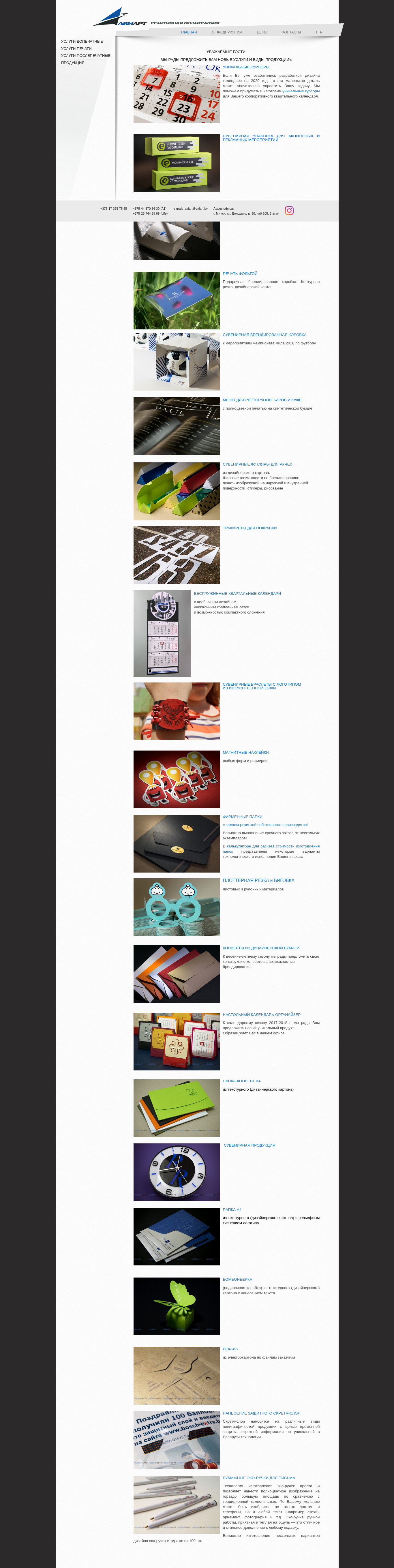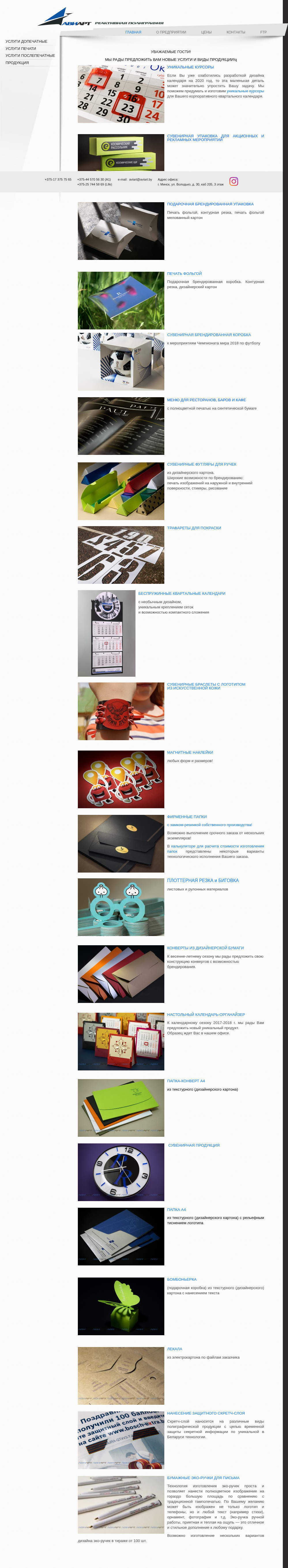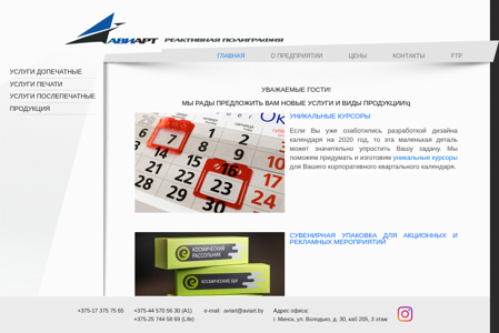 | AI-анализ | robots: index,follow This online resource is the official website of Aviart, a Belarusian company that specializes in providing various services and products, including printing, cutting, and design. The website's main page features a prominent announcement about the company's readiness to offer new services and products, as well as a showcase of their unique products, such as custom-designed calendars, gift boxes, and branded packaging. The site also highlights their expertise in creating special effects, such as foil printing and contour cutting, and offers various services for restaurants, bars, and cafes. Additionally, the website provides information about their company, including prices, contacts, and FTP access. The website's keywords and top words suggest that the primary focus is on printing and design services, with a secondary emphasis on corporate gifts and promotional products. The site's content is primarily in Russian, with some English text present. Overall, the website appears to be a professional online presence for a Belarus |