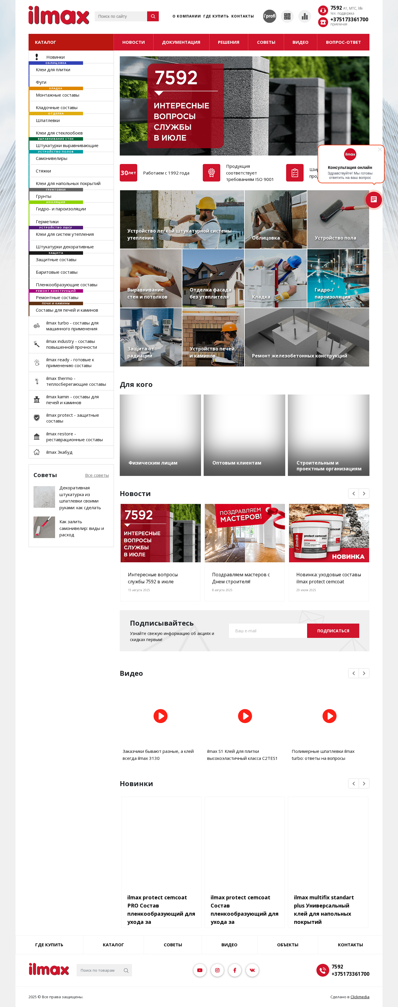 | AI-анализ | The Ilmax.by website is the online platform for a Belarusian construction materials manufacturer and supplier, offering a range of over 90 products including plaster, screeds, sealants, self-leveling compounds, flooring underlayments, and insulation materials. Services include technical support (7592). Product categories include wall and floor coverings, tile adhesives, gypsum and cement-based products, insulation systems, and heating and fireplace solutions. The site also features news, documentation, and technical support resources. |