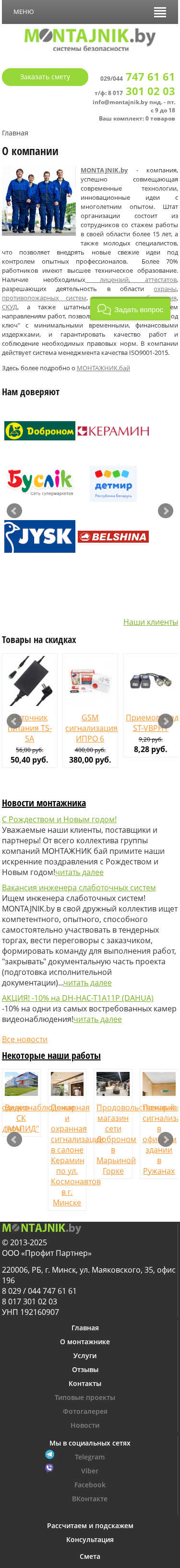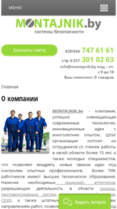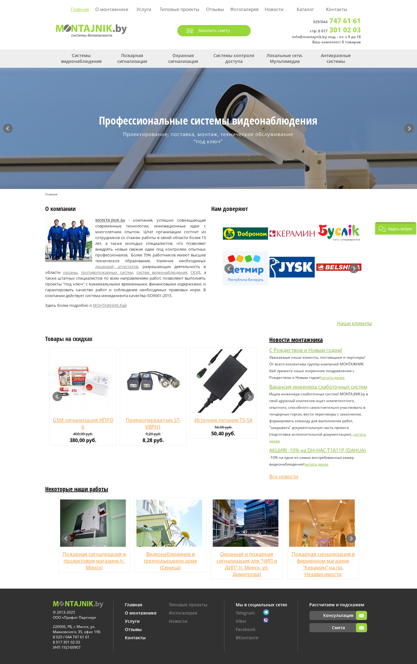 | AI-анализ | --- The website is a professional security systems provider offering fire and security alarm systems, video surveillance, and access control systems (SKUD) in Minsk and regions. The menu includes sections on the company, services for video surveillance project design, video surveillance mounting, video surveillance maintenance, project design for fire alarm systems, fire alarm system maintenance, security alarm system maintenance, electrical system installation for offices, and security systems for shops in Minsk. The site also features typical projects, customer reviews, a photo gallery, news, a catalog, contacts, and a quote request form. The company, MONTAJNIK.by, has a team of experienced professionals and young specialists, with over 70% having higher technical education. The company holds necessary licenses and certifications for security, fire protection, video surveillance, access control, and local networks. The company guarantees quality work and adherence to legal norms, and operates |