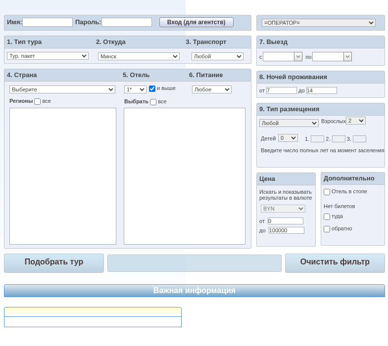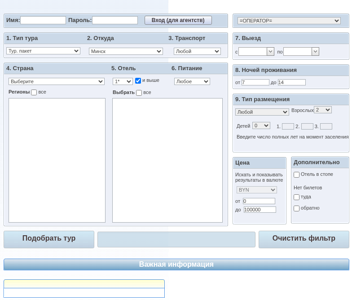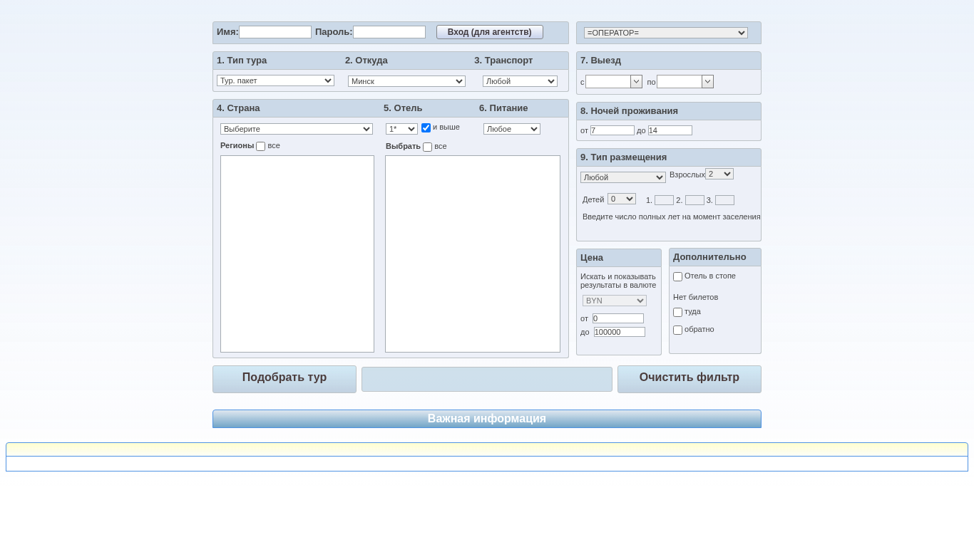 | AI-анализ | --- The website "Touring.by" is a travel booking platform, with a focus on accommodation reservations. Users can select the type of tour, origin, transportation method, destination country, hotel, and type of board. Countries available for travel include Bulgaria, Lebanon, Russia, and Sловения, among others. Users can choose from various types of accommodation, such as apartments, studios, rooms, and suites, with options for connecting rooms and different capacities. Some listings include special offers and villas. The website also allows users to choose the number of nights and the type of lodging, with options ranging from economy to premium. The search function is accessible through the homepage, with filters for the number of travelers, type of room, and board. The website does not provide any contact information or links. |