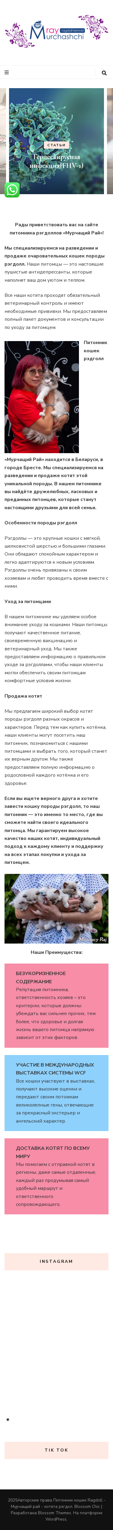 | AI-анализ | The portal is a Ragdoll cat breeder named 'Мурчащий рай' (Murcashing ray, which translates to 'Murcashing Paradise' in English). It offers visitors articles on various topics related to Ragdoll cats, including 'Idiopathic Cystitis', 'Vaccination with Biofel vaccine', 'Feeding cats with fish', and 'Gerpesvirus infection (FHV-1)'. The site also features information on 'What to do if a cat goes to the toilet in an inappropriate place?' and 'Cat litter boxes'. The main focus of the portal is the sale of Ragdoll kittens, with sections on 'Our Kittens for Sale', 'Our Cats', and 'Our Kittens'. The breeder provides full documentation and consultation on cat care. The Ragdoll cat breeder ' |
