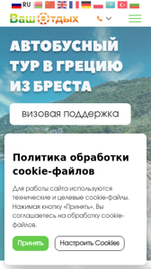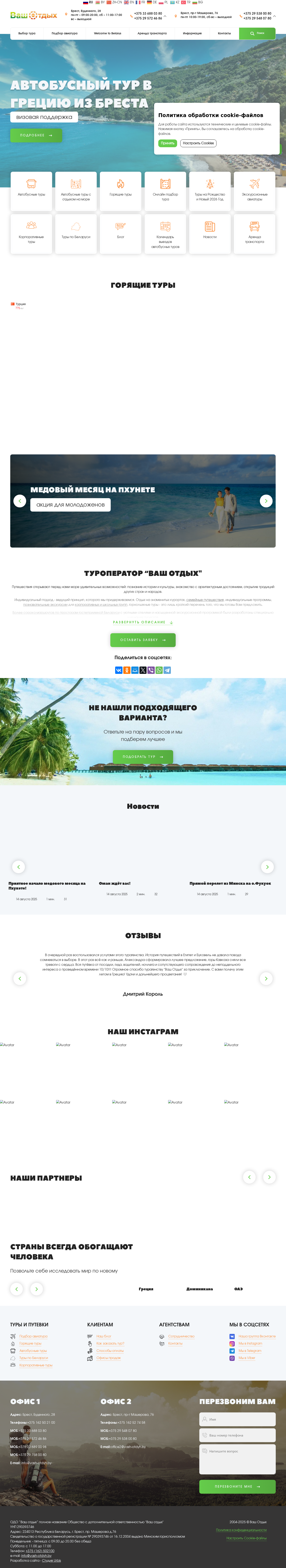 | AI-анализ | language: ru --- The website is a travel company named 'Ваш отдых' (Your Vacation) offering vacations in various countries including Turkey, Bulgaria, Egypt, Chernogoria, Italy, Spain, France, Poland, Cuba, Dominican Republic, Vietnam, India, and others. The company's offices are located in Brest, Belarus, and contact information is provided for making inquiries or booking tours. The website offers various types of tours, such as individual, corporate, thematic, and group tours, as well as airport transfers, visa assistance, and transportation rentals. The website also features a blog, news section, and a calendar of tour departures. The company's services include tours to Europe with visa support, tours within Belarus, and seaside vacations with online tour selection. The website also offers winter holidays and corporate events. The website is available |