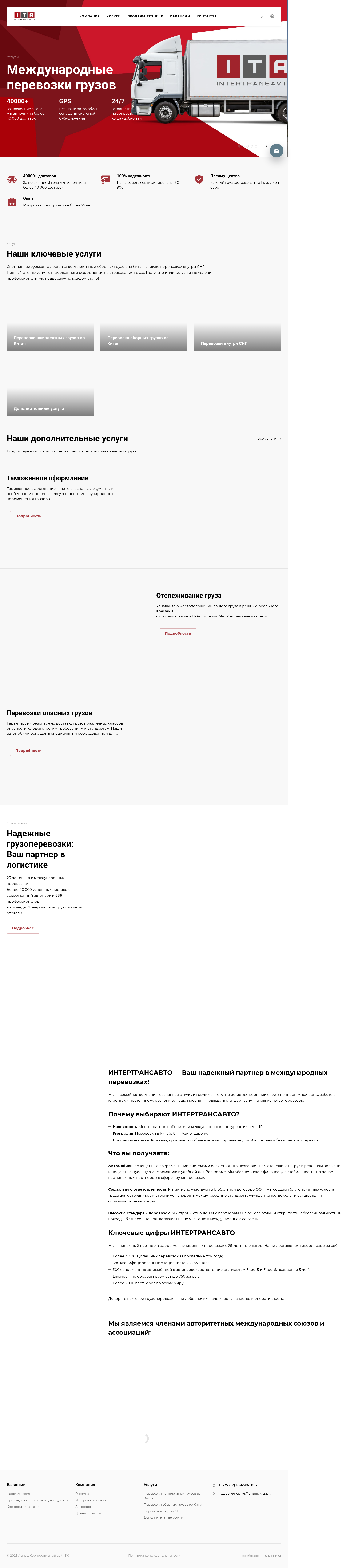 | AI-анализ | This online resource is a corporate website for Intertransavto, a transportation company based in Dzerzhinsk, Belarus. The site offers various transportation services, including the shipping of full cargo loads from China, transportation of valuable goods, hazardous materials, project cargo, and oversized cargo, as well as the sale of vehicles and job opportunities. The company operates within the CIS and provides additional services such as customs clearance, online tracking, and cargo insurance. The website is available in both Russian and English languages, and contact information includes phone numbers and an email address. The site also features a section for corporate life and company history. |
