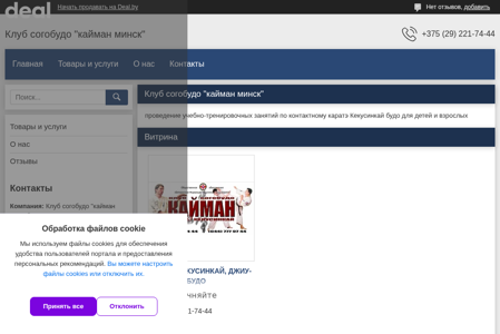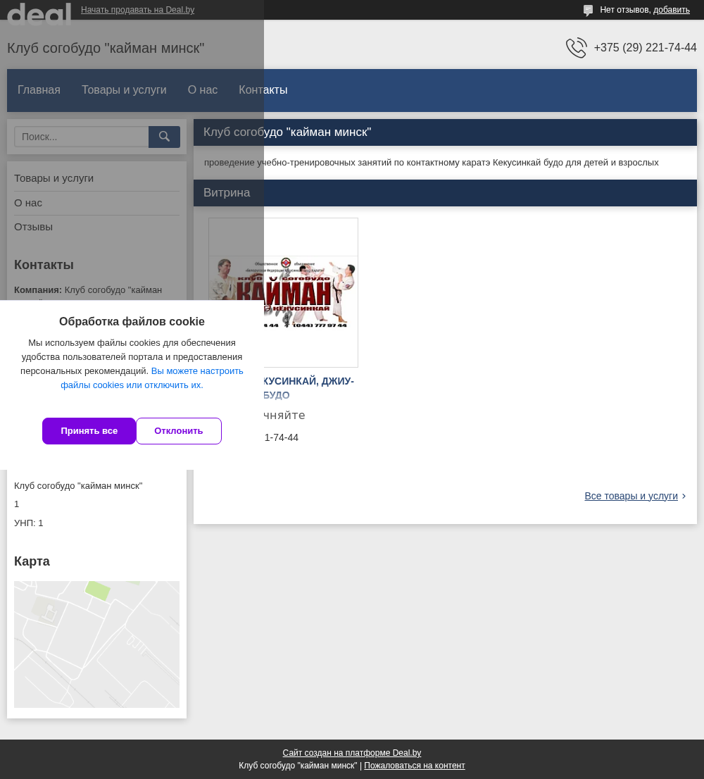 | AI-анализ | This website is for "Клуб согобудо "кайман минск"" and provides contact information, products, and services related to the company. The website is hosted on the Deal.by platform and uses cookies for user convenience and personalized recommendations. The business offers martial arts training in contact karate Kekusinkai Budo for children and adults. The website includes a section for all the products and services offered, as well as contact information and a location in Minsk, Belarus. The company's UNP number is listed as 1. |