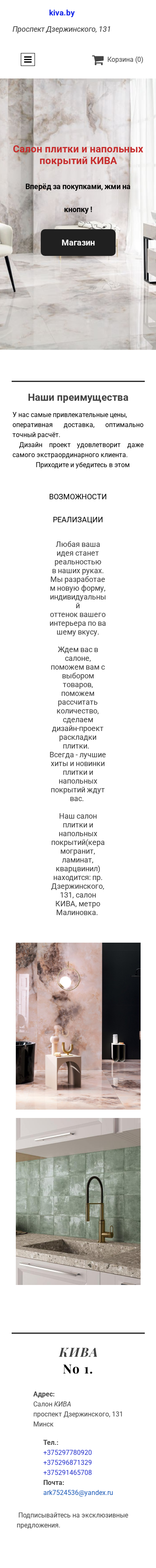 The website is for a flooring and tiling store named KIVA, located at Prospect Dzerzhynski, 131 in Minsk, Belarus. The store offers a range of flooring and covering options, including laminate. The site's title, description, and top keywords all reflect this focus on laminate and flooring. The store highlights its advantages, such as attractive pricing, prompt delivery, and individualized design projects. The store's contact information, including phone numbers and email address, are provided, as well as a mention of social media accounts and potential bonuses for subscribing. The store is open Monday through Friday from 10:00 to 19:00 and Saturdays from 11:00 to 16:00, with the possibility of extended hours by appointment.