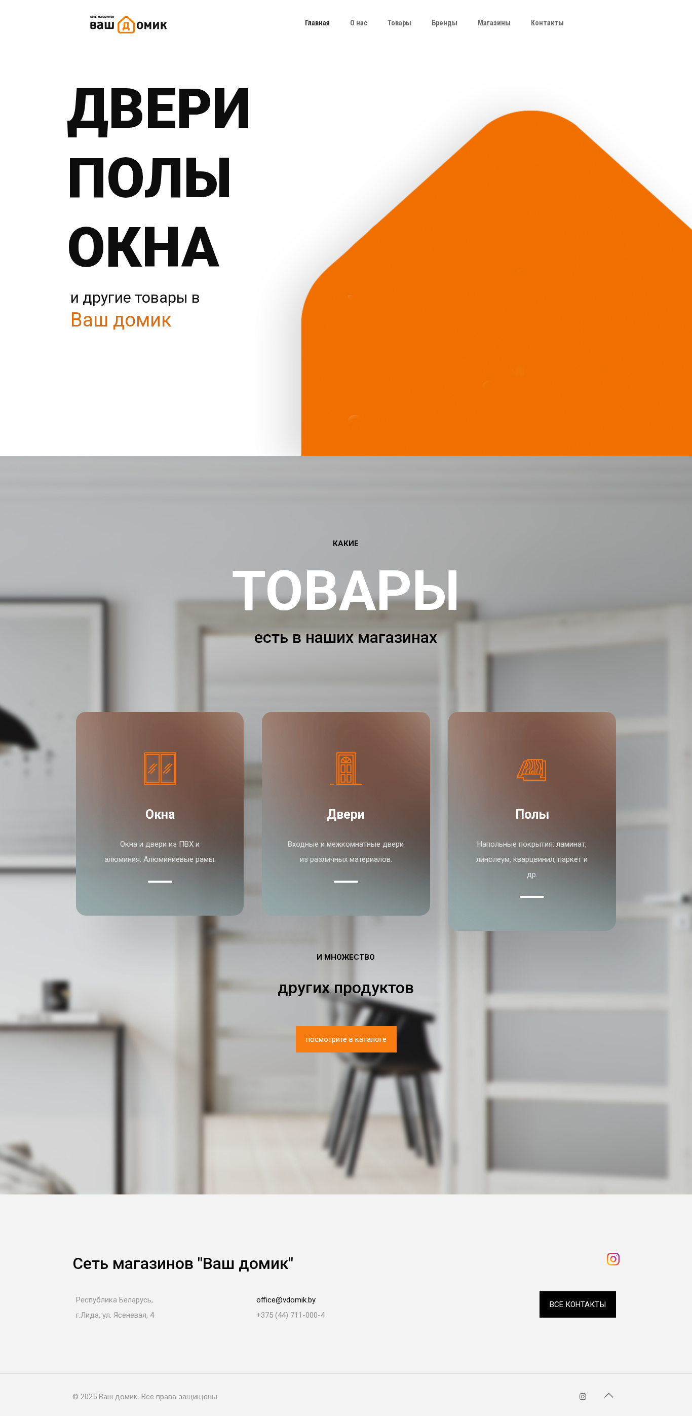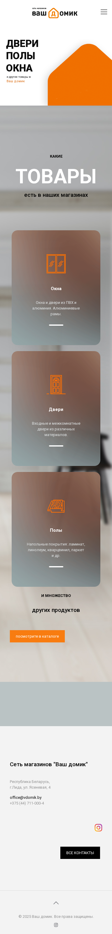 | AI-анализ | --- The website "Ваш домик – сеть магазинов товаров для дома" (Your House – Network of Home Goods Stores) is the main page of a chain of home improvement stores operating in Belarus. The title and top keywords suggest that the website offers a wide range of home-related products, including doors, windows, and floors. The description also mentions "какие товары есть в наших магазинах" (what products are in our stores), indicating that a catalog or inventory is available. The website includes sections for "О нас" (About Us), "Товары" (Products), "Бренды" (Brands), and "Магазины" (Stores), suggesting a comprehensive offering. The contact information, including an address, phone number, and email address, are provided at the bottom of the page. The |