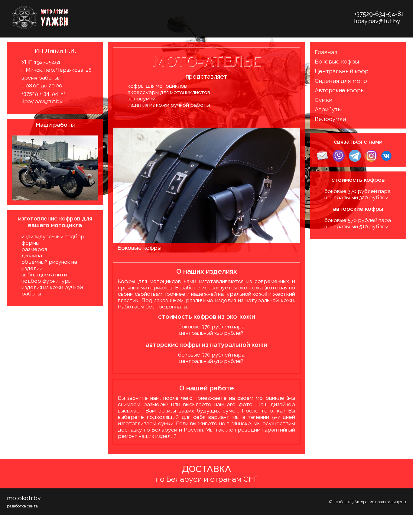 | SEO-описание | изготовление кофров для мотоциклов, боковые кофры, центральный кофр, сумки, сумки на пояс, сумки для мотоциклов, сумки для велосипедов |