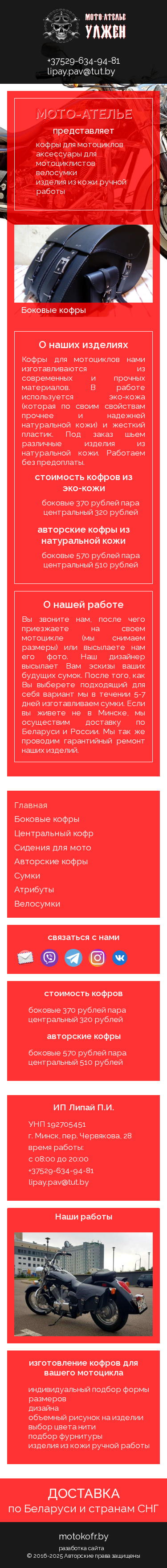 | AI-анализ | The portal motokofr.by is a custom leatherwork shop specializing in the production of motorcycle and bicycle bags. Offered items include side and central saddlebags, backpacks, waist bags for motorcycles and bicycles. The shop also provides custom-made leather goods in various sizes and designs, with the option to choose thread color and fittings. The products are made from modern and durable materials such as eco-leather and plastic. Customers can either bring their motorcycle in for measurements or send a photo for a quote. The shop offers a 5-7 day turnaround and delivery within Belarus and Russia. Additionally, the shop provides a warranty repair service. |