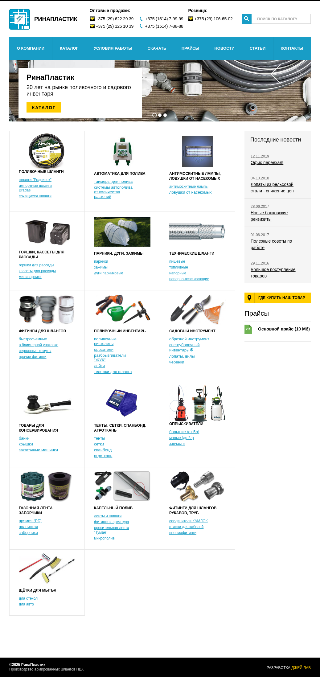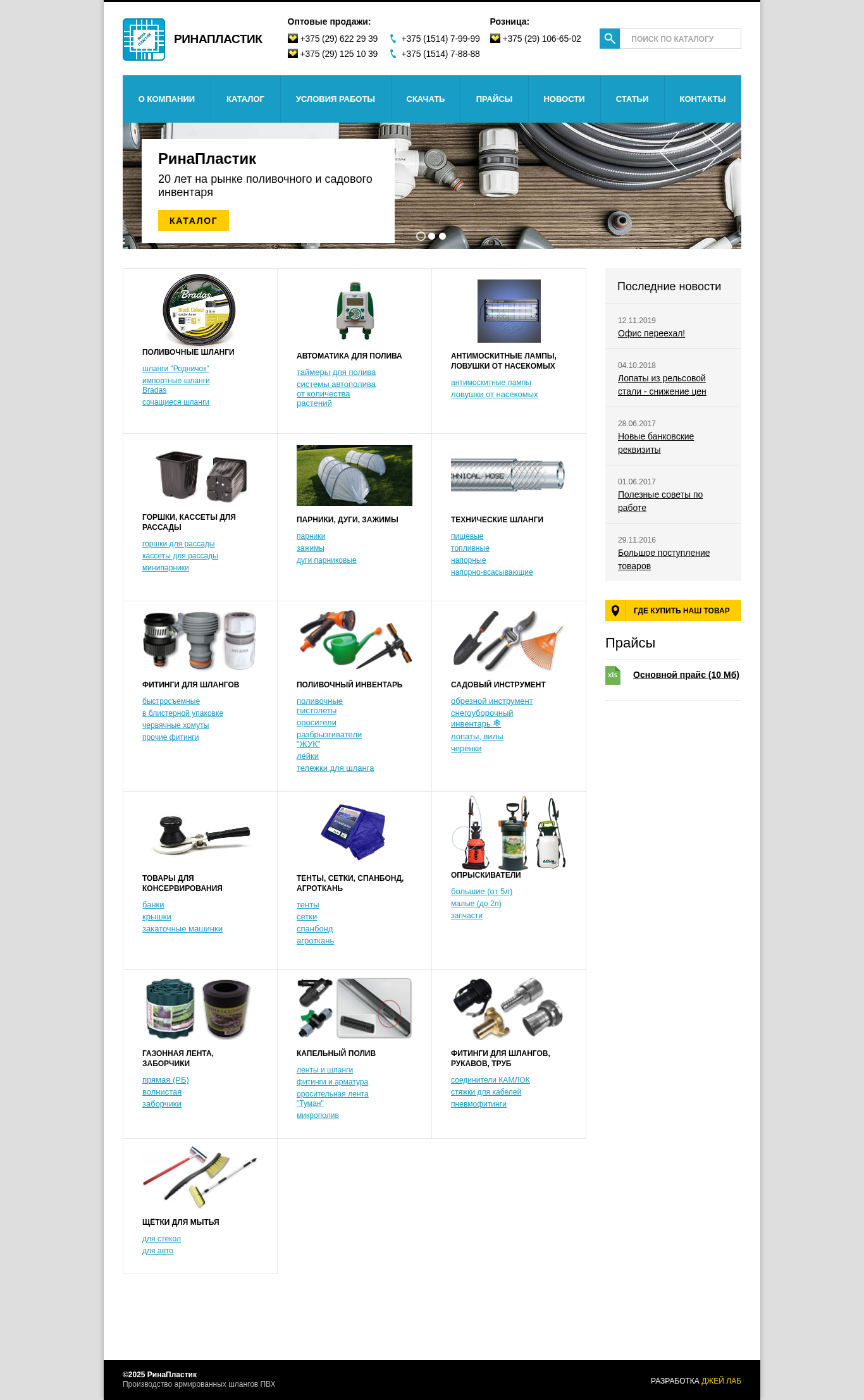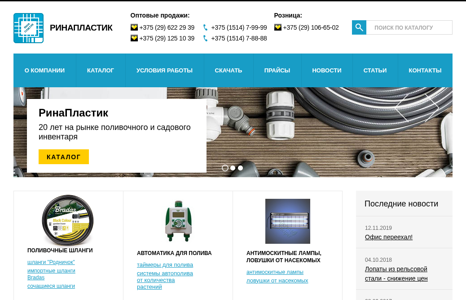 | AI-анализ | This online resource, titled "РинаПластик" and identified by the domain name rinaplastic.by, offers a catalog of PVC piping and gardening supplies. The description mentions the sale of various types of pipes, including "шланги" (pipes) and "сочащиеся шланги" (coupling pipes), as well as fittings, irrigation systems, and anti-mosquito devices. The company, which has been in business for 20 years, is an official distributor of Bradas products in Belarus. The website also includes a section for news and articles, as well as contact information for purchasing and inquiries. The catalog covers a range of products for both commercial and retail sales, with various methods of contact provided for each. The company's address and map are also included on the site, along with a |