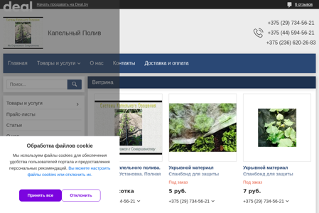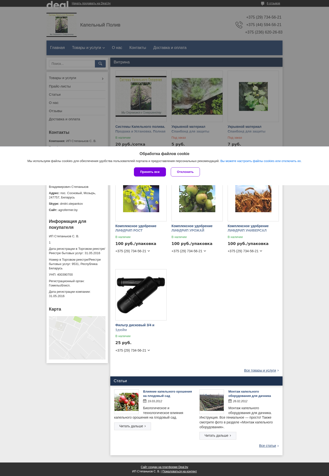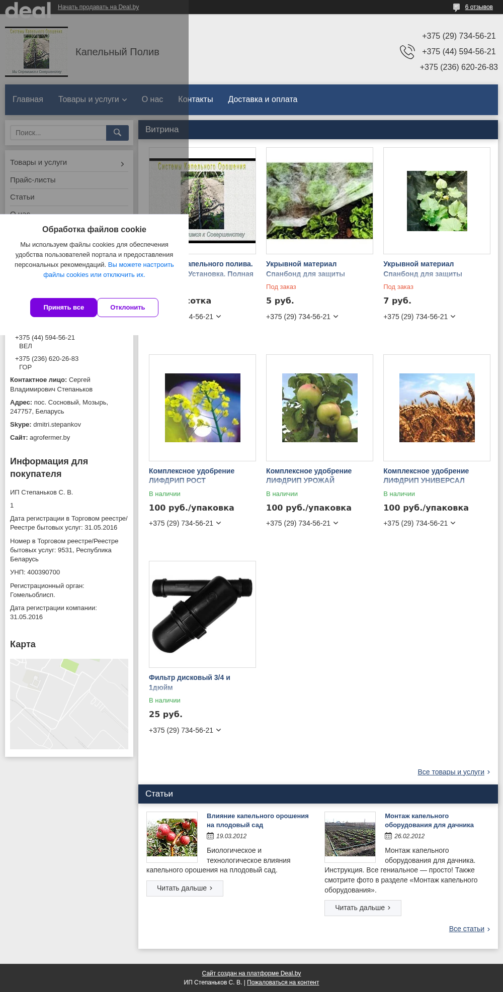 | AI-анализ | This website is an e-commerce platform for the company "ИП Степаньков С. В.", selling agricultural products and services related to capillary irrigation. The website provides contact information, lists the offered items and services, and their prices. Products include protective materials for plants and crops, such as spandbond, and complex fertilizers. The website also features articles about the benefits of capillary irrigation for fruit gardens and instructions for installing capillary irrigation systems for homeowners. Users can contact the company using multiple phone numbers, including those for MTS, Velcom, and GSM networks. The website is a part of the Deal.by platform and has received six positive reviews. |