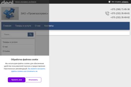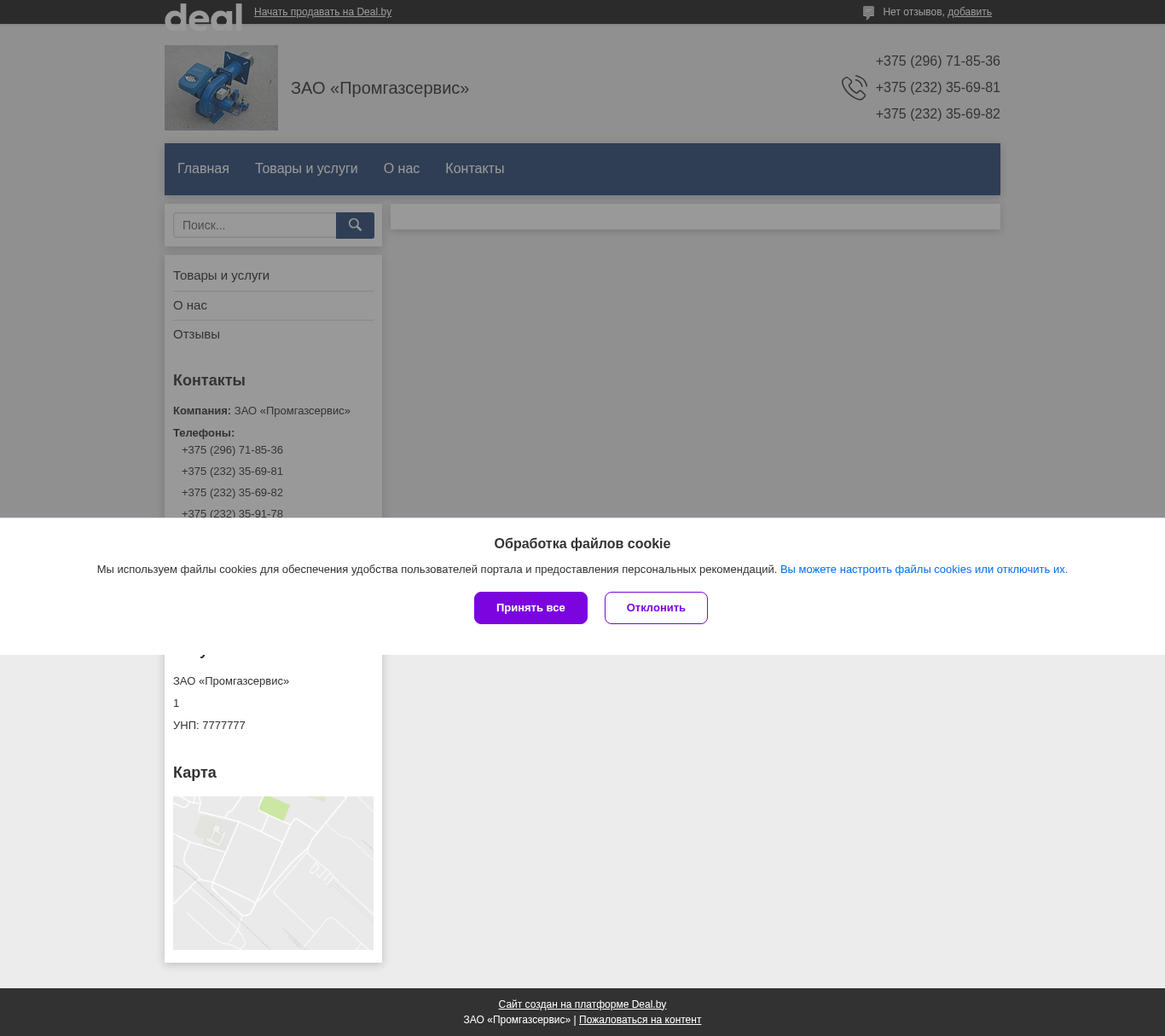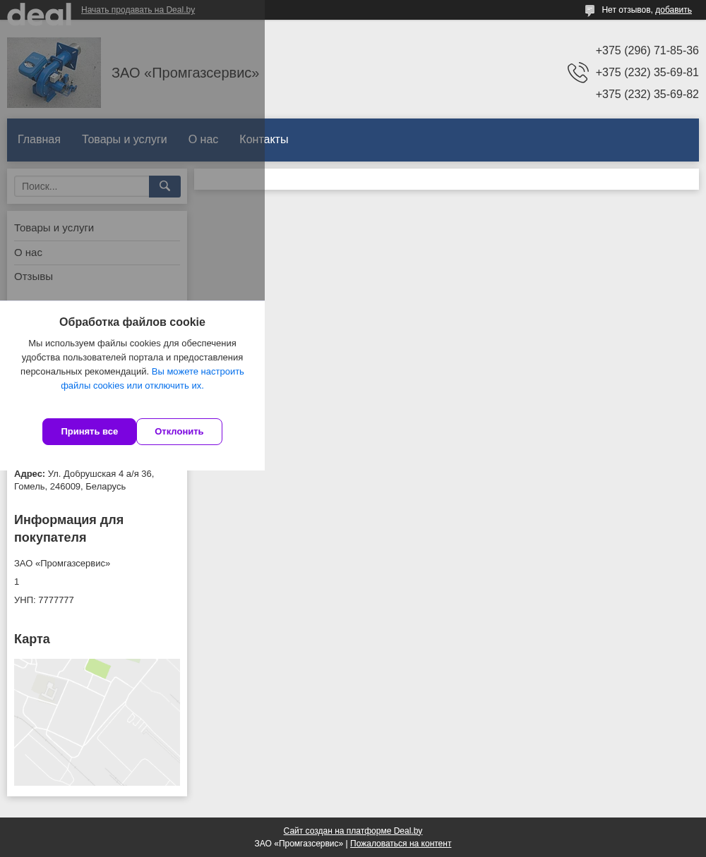 | AI-анализ | The portal "ЗАО «Промгазсервис»" is a business website for a Belarusian company of the same name, providing contacts, goods, and services. The company's UNP number is 7777777. The site is built on the Deal.by platform and uses cookies for user convenience and personalized recommendations. The main sections include 'Home,' 'Products and Services,' 'About Us,' and 'Contacts.' The website offers contact information, a list of products and services, and no customer reviews are present. The contact details provided are three phone numbers and an email address, along with the company's address in Goemel, Belarus. |